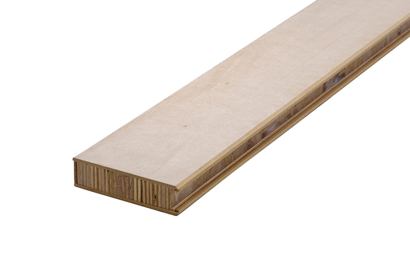 LVLの表裏面にMDFを貼り合わせた材であり、LVLの強度とMDFの表面性を兼ね備えた加工材。
